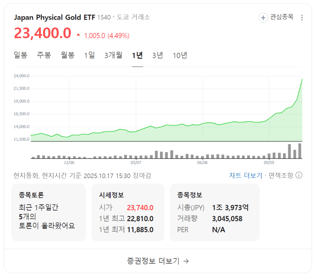 2025/10/19, 현물 보관형 금 ETF 가격이 미친 듯이 치솟았다. 특히 1540 ETF는 종가 기준으로도 프리미엄이 무려 +13.85%나 붙었고, 장중에는 20%에 육박하는 프리미엄까지 벌어지기도 했다.