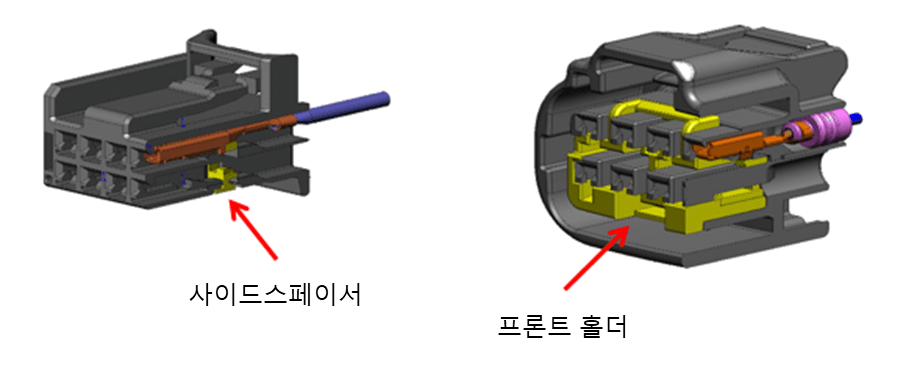 커넥터 하우징에 단자를 집어넣고 사이드스페이서, 프론트 홀더를 박아넣는다. 단자가 제대로 들어가지 않은경우 사이드스페이서, 프론트 홀더가 제대로 결합이 되지 않아 단자가 제대로 들어갔는지 검증이 가능하며 단자스페이서와 홀더로 2차고정이 되어서 단자가 쉽게 빠지지 않는다.
